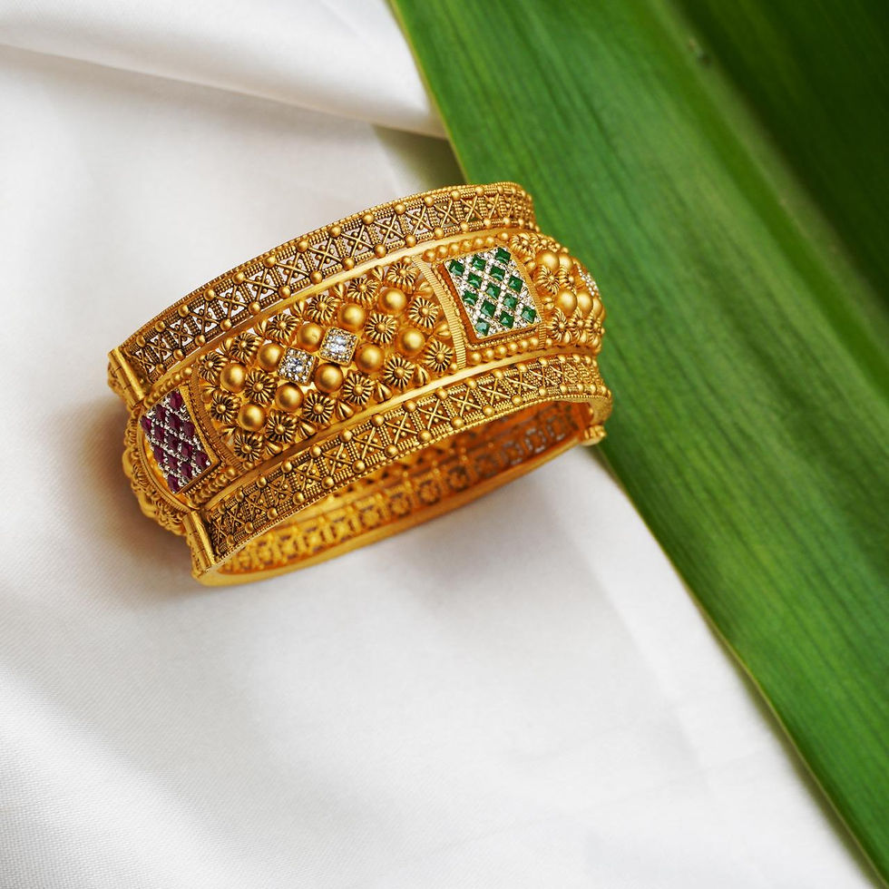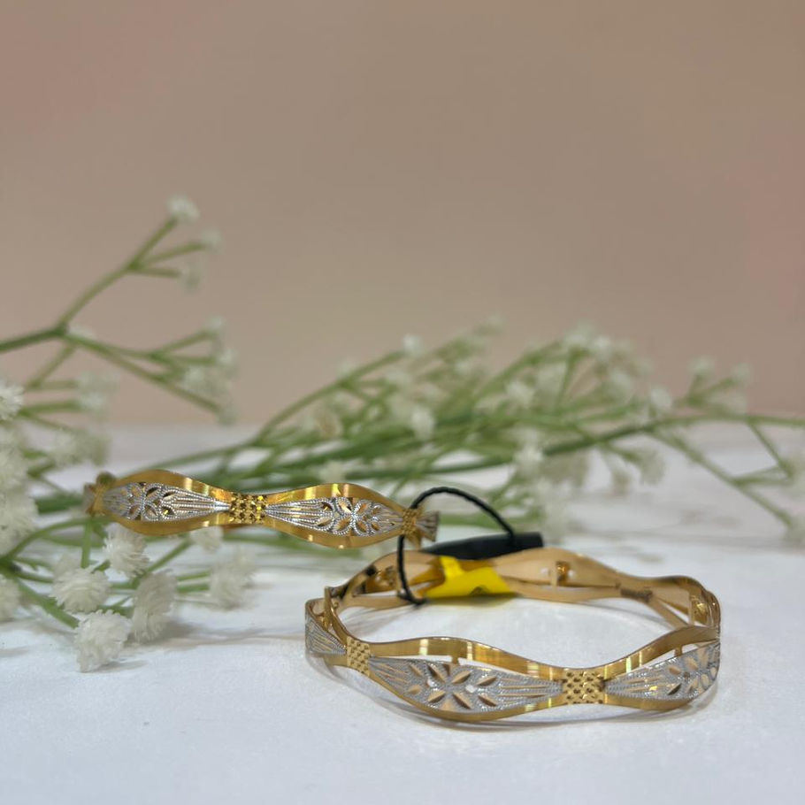 These sophisticated bangles combine polished gold with intricate silver-toned pattern work featuring floral and geometric motifs. The contrasting finishes and detailed craftsmanship create elegant pieces that blend traditional Indian design elements with modern styling sensibilities.